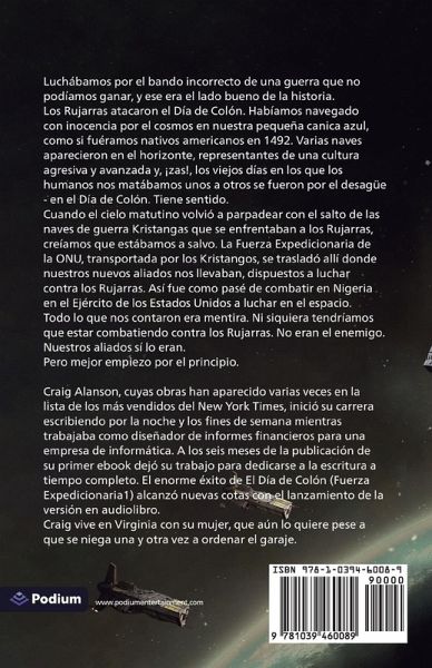 Luchábamos por el bando incorrecto de una guerra que no podíamos ganar, y ese era el lado bueno de la historia. Los Rujarras atacaron el Día de Colón. Habíamos navegado con inocencia por el cosmos en nuestra pequeña canica azul, como si fuéramos nativos americanos en 1492. Varias naves aparecieron en el horizonte, representantes de una cultura agresiva y avanzada y, ¡zas!, los viejos días en los que los humanos nos matábamos unos a otros se fueron por el desagüe - en el Día de Colón. Tiene sentido. Cuando el cielo matutino volvió a parpadear con el salto de las naves de guerra Kristangas que se enfrentaban a los Rujarras, creíamos que estábamos a salvo. La Fuerza Expedicionaria de la ONU, transportada por los Kristangos, se trasladó allí donde nuestros nuevos aliados nos llevaban, dispuestos a luchar contra los Rujarras. Así fue como pasé de combatir en Nigeria en el Ejército de los Estados Unidos a luchar en el espacio. Todo lo que nos contaron era mentira. Ni siquiera tendríamos que estar combatiendo contra los Rujarras. No eran el enemigo. Nuestros aliados sí lo eran. Pero mejor empiezo por el principio.