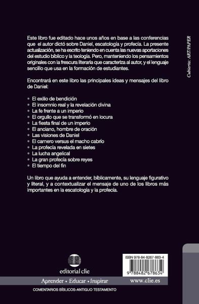 Este libro fue editado hace unos ä¿os en base a las conferencias que el autor dict¿¿ sobre Daniel, escatolog¿¿a y profec¿¿a. La presente actualizaci¿¿n, se ha escrito teniendo en cuenta las nuevas aportaciones del estudio b¿¿blico, pero manteniendo la frescura literaria que caracteriza al autor y el lenguaje sencillo que se usa en la formaci¿¿n de estudiantes. Un libro que ayuda a entender, b¿¿blicamente, su lenguaje figurativo y literal, y a contextualizar el mensaje de uno de los libros m¿¿s importantes en la escatolog¿¿a y la profec¿¿a.