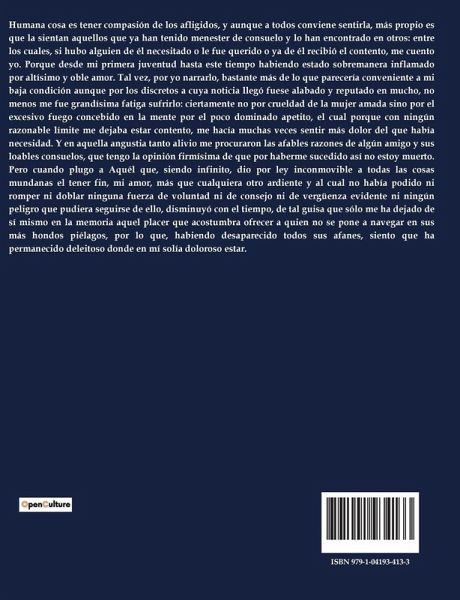 Humana cosa es tener compasión de los afligidos, y aunque a todos conviene sentirla, más propio es que la sientan aquellos que ya han tenido menester de consuelo y lo han encontrado en otros: entre los cuales, si hubo alguien de él necesitado o le fue querido o ya de él recibió el contento, me cuento yo. Porque desde mi primera juventud hasta este tiempo habiendo estado sobremanera inflamado por altísimo y oble amor. Tal vez, por yo narrarlo, bastante más de lo que parecería conveniente a mi baja condición aunque por los discretos a cuya noticia llegó fuese alabado y reputado en mucho, no menos me fue grandísima fatiga sufrirlo: ciertamente no por crueldad de la mujer amada sino por el excesivo fuego concebido en la mente por el poco dominado apetito, el cual porque con ningún razonable límite me dejaba estar contento, me hacía muchas veces sentir más dolor del que había necesidad. Y en aquella angustia tanto alivio me procuraron las afables razones de algún amigo y sus loables consuelos, que tengo la opinión firmísima de que por haberme sucedido así no estoy muerto. Pero cuando plugo a Aquél que, siendo infinito, dio por ley inconmovible a todas las cosas mundanas el tener fin, mi amor, más que cualquiera otro ardiente y al cual no había podido ni romper ni doblar ninguna fuerza de voluntad ni de consejo ni de vergüenza evidente ni ningún peligro que pudiera seguirse de ello, disminuyó con el tiempo, de tal guisa que sólo me ha dejado de sí mismo en la memoria aquel placer que acostumbra ofrecer a quien no se pone a navegar en sus más hondos piélagos, por lo que, habiendo desaparecido todos sus afanes, siento que ha permanecido deleitoso donde en mí solía doloroso estar.