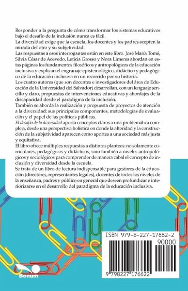 Responder a la pregunta de cömo transformar los sistemas educativos bajo el desafi¿o de la inclusiön nunca es fäcil. La diversidad exige que la escuela, los docentes y los padres acepten la mirada del otro y su subjetividad. Las respuestas a esos interrogantes estän en este libro. Jose¿ Mari¿a Tome¿, Silvia Ce¿sar de Acevedo, Leticia Grosso y Nora Limeres abordan en es- tas päginas los fundamentos filosöficos y antropolögicos de la educaciön inclusiva y explican el engranaje epistemolögico, didäctico y pedagögico de la educaciön inclusiva en un recorrido por su historia. Los cuatro autores (que son docentes e investigadores del ärea de Educaciön de la Universidad del Salvador) desarrollan, con un lenguaje sencillo y claro, propuestas de intervenciones educativas y abordajes de la discapacidad desde el paradigma de la inclusiön. Tambie¿n se aborda la realizaciön y propuesta de proyectos de atenciön a la diversidad: sus principales componentes, metodologi¿as de evaluaciön y el papel de las poli¿ticas püblicas. El desafío de la diversidad aporta conceptos claros a una problemática compleja, desde una perspectiva holística en donde la alteridad y la construcción de la subjetividad aparecen como aportes a una sociedad más justa y equitativa. El libro ofrece múltiples respuestas a distintos planteos: no solamente curriculares, pedagógicos y didácticos, sino también a niveles antropológicos y sociológicos para comprender de manera cabal el concepto de inclusión y diversidad desde la escuela. Se trata de un libro de lectura indispensable para gestores de la educación (directores, representantes legales), docentes de todos los niveles de la enseñanza, padres y público en general que deseen profundizar e interiorizarse en el desarrollo del paradigma de la educación inclusiva. Este libro contiene el desarrollo de los siguientes temas entre otros: -Educación inclusiva -Fundamentos filosóficos y sociantropológicos en la sociedad del conocimiento -Inclusión y discapacidad -Proyectos inclusivos de atención a la diversidad Con este libro aprenderá a fomentar la unidad en la diversidad. ¡ue ya este libro y comience a aprender con este manual de relaciones sociales!Descarg