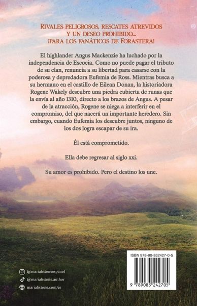 Rivales peligrosos, rescates atrevidos y un deseo prohibido... ¡para los fanáticos de Forastera! El highlander Angus Mackenzie ha luchado por la independencia de Escocia. Como no puede pagar el tributo de su clan, renuncia a su libertad para casarse con la poderosa y depredadora Eufemia de Ross. Mientras busca a su hermano en el castillo de Eilean Donan, la historiadora Rogene Wakely descubre una piedra cubierta de runas que la envía al año 1310, directo a los brazos de Angus. A pesar de la atracción, Rogene se niega a interferir en el compromiso, del que nacerá un importante heredero. Sin embargo, cuando Eufemia los descubre juntos, ninguno de los dos logra escapar de su ira. Él está comprometido. Ella debe regresar al siglo xxi. Su amor es prohibido. Pero el destino los une. *Traducido al español de Latinoamérica