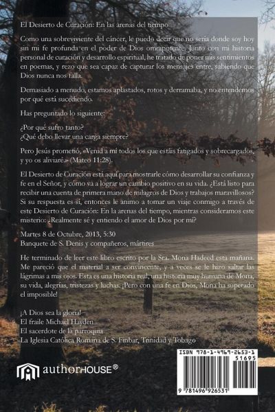 El Desierto de Curación: En las arenas del tiempo Como una sobreviviente del cáncer, le puedo decir que no sería donde soy hoy sin mi fe profunda en el poder de Dios omnipotente. Junto con mi historia personal de curación y desarrollo espiritual, he tratado de poner mis sentimientos en poemas, y rezo que sea capaz de capturar los mensajes entre, sabiendo que Dios nunca nos falla. Demasiado a menudo, estamos aplastados, rotos y derramaba, y no entendemos por qué está sucediendo. Has preguntado lo siguiente: ¿Por qué sufro tanto? ¿Qué debo llevar una carga siempre? Pero Jesús prometió, Venid a mí todos los que estáis fatigados y sobrecargados, y yo os aliviaré. (Mateo 11:28 El Desierto de Curación está aquí para mostrarle cómo desarrollar su confianza y fe en el Señor, y cómo va a lograr un cambio positivo en su vida ¿Está listo para recibir una cuenta de primera mano de milagros de Dios y trabajos maravillosos? Si su respuesta es sí, entonces le animo a tomar un viaje conmigo a través de este Desierto de Curación: En la arenas del tiempo, mientras consideramos este misterio: ¿Realmente sé y entiendo el amor de Dios por mí? Martes 8 de Octubre, 2013, 5:30 Banquete de S. Denis y compañeros, mártires He terminado de leer este libro escrito por la Sra. Mona Hadeed esta mañana. Me pareció que el material a ser convincente, y a veces se le hizo saltar las lágrimas a mis ojos. Esta es una historia real, una historia muy humana de Mona, su vida, alegrías, tristezas y luchas. ¡Pero con una fe en Dios, Mona ha superado el imposible! ¡A Dios sea la gloria! El fraile Michael Hayden El sacerdote de la parroquia La Iglesia Católica Romana de S. Finbar, Trinidad y Tobago