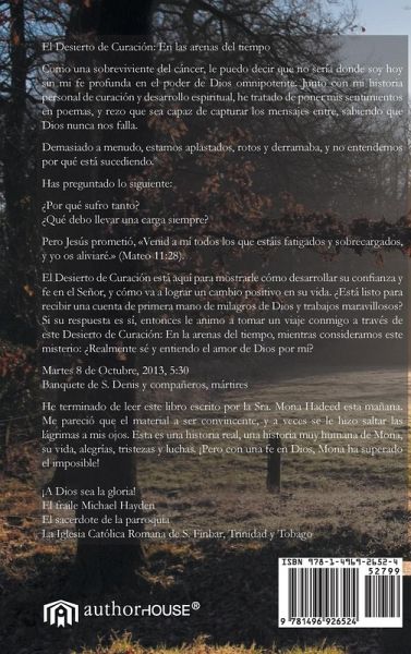 El Desierto de Curación: En las arenas del tiempo Como una sobreviviente del cáncer, le puedo decir que no sería donde soy hoy sin mi fe profunda en el poder de Dios omnipotente. Junto con mi historia personal de curación y desarrollo espiritual, he tratado de poner mis sentimientos en poemas, y rezo que sea capaz de capturar los mensajes entre, sabiendo que Dios nunca nos falla. Demasiado a menudo, estamos aplastados, rotos y derramaba, y no entendemos por qué está sucediendo. Has preguntado lo siguiente: ¿Por qué sufro tanto? ¿Qué debo llevar una carga siempre? Pero Jesús prometió, Venid a mí todos los que estáis fatigados y sobrecargados, y yo os aliviaré. (Mateo 11:28 El Desierto de Curación está aquí para mostrarle cómo desarrollar su confianza y fe en el Señor, y cómo va a lograr un cambio positivo en su vida ¿Está listo para recibir una cuenta de primera mano de milagros de Dios y trabajos maravillosos? Si su respuesta es sí, entonces le animo a tomar un viaje conmigo a través de este Desierto de Curación: En la arenas del tiempo, mientras consideramos este misterio: ¿Realmente sé y entiendo el amor de Dios por mí? Martes 8 de Octubre, 2013, 5:30 Banquete de S. Denis y compañeros, mártires He terminado de leer este libro escrito por la Sra. Mona Hadeed esta mañana. Me pareció que el material a ser convincente, y a veces se le hizo saltar las lágrimas a mis ojos. Esta es una historia real, una historia muy humana de Mona, su vida, alegrías, tristezas y luchas. ¡Pero con una fe en Dios, Mona ha superado el imposible! ¡A Dios sea la gloria! El fraile Michael Hayden El sacerdote de la parroquia La Iglesia Católica Romana de S. Finbar, Trinidad y Tobago