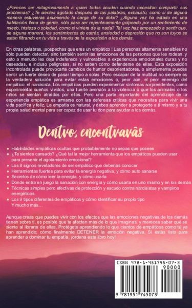 ¿Pareces ser milagrosamente a quien todos acuden cuando necesitan compartir sus problemas? ¿Te sientes agotado después de las palabras, exhausto, como si de alguna manera estuvieras asumiendo la carga de su dolor? ¿Alguna vez ha estado en una habitación llena de gente, sólo para ser repentinamente golpeado por un sentimiento de miedo, tristeza o soledad, como si viniera de la nada? Tal vez haz empezado a sentir que, de alguna manera, los sentimientos de estrés, ansiedad o depresión que no son tuyos se están filtrando en tu vida a través de la exposición a los demás. En otras palabras, ¡sospechas que eres un empático! Las personas altamente sensibles no sólo pueden detectar, sino también sentir las emociones de las personas que les rodean, y esto a menudo les deja indefensos y vulnerables a experiencias emocionales duras y no deseadas, e incluso peligrosas, si no saben cómo defenderse de ellas. Esta exposición incontrolada puede provocarte cambios de humor desorientadores, o simplemente puedes sentir un fuerte deseo de pasar tiempo a solas. Pero escapar de la multitud no siempre es la verdadera solución para evitar estas emociones o, peor aún, el peor enemigo del empático: el narcisista. Los empáticos pueden experimentar síntomas sorprendentes, como experimentar sueños vívidos, una fuerte aversión a la violencia o que los animales o los niños se sientan atraídos por ellos. Pero una parte importante del aprendizaje de la experiencia empática es armarse con las defensas críticas que necesitas para vivir una vida pacífica y feliz. La empatía es natural, y debes aprender a protegerte a ti mismo y a tu propia salud mental para ser capaz de usar tu don para ayudar a los demás. Este libro es tu vía rápida para llegar allí. En él, descubrirás:Habilidades empáticas ocultas que probablemente no sepas que posees ¿Te sientes cansado? ¿Qué tal la mejor herramienta que los empáticos pueden usar para prevenir el agotamiento emocional? Los 8 signos reveladores de ser empático que deberías conocer Herramientas fuertes para evitar la energía negativa, y cómo auto sanarse Secretos de cómo leer la energía, y cómo usarla Donde entra en juego la sanación con energía y cómo usarla en uno mismo y en los demás Técnicas simples pero efectivas de protección y escudo contra narcisistas y vampiros energéticos Los 9 tipos diferentes de empáticos y cómo identificar su propio tipo Y mucho más... Aunque creas que puedes vivir con los efectos que las emociones negativas de los demás tienen sobre ti, es posible que te afecten más de lo que imaginas, y mereces saber qué se siente al librarte de ellas. Protégete aprendiendo lo que cientos de empáticos como tú ya han aprendido; cómo finalmente DETENER la emoción negativa. Si estás listo para aprender a dominar tu empatía, ¡ordena este libro hoy!