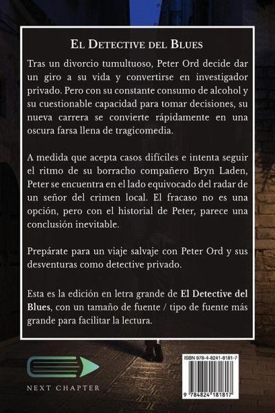 Tras un divorcio tumultuoso, Peter Ord decide dar un giro a su vida y convertirse en investigador privado. Pero con su constante consumo de alcohol y su cuestionable capacidad para tomar decisiones, su nueva carrera se convierte rápidamente en una oscura farsa llena de tragicomedia. A medida que acepta casos difíciles e intenta seguir el ritmo de su borracho compañero Bryn Laden, Peter se encuentra en el lado equivocado del radar de un señor del crimen local. El fracaso no es una opción, pero con el historial de Peter, parece una conclusión inevitable. Prepárate para un viaje salvaje con Peter Ord y sus desventuras como detective privado. Esta es la edición en letra grande de El Detective del Blues, con un tamaño de fuente / tipo de fuente más grande para facilitar la lectura.