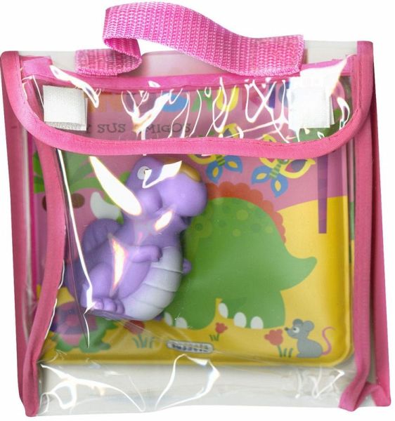 Un libro de plástico acolchado con ilustraciones a todo color de un simpático dinosaurio y sus amigos, y un muñeco de goma con sonido pensados para que los más pequeños de la casa disfruten siempre de la hora del baño.