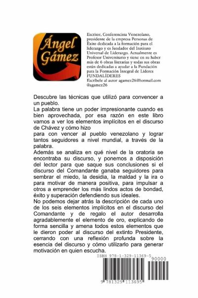 En este libro vamos a ver los elementos implícitos en el discurso de Chávez y cómo hizo para con vencer al pueblo venezolano y lograr tantos seguidores a nivel mundial, a través de la palabra. Además se analiza en qué nivel de la oratoria se encontraba su discurso, y ponemos a disposición del lector para que saque sus conclusiones si el discurso del Comandante ganaba seguidores para sembrar el miedo, la desidia, la maldad y la ira o para motivar de manera positiva, para impulsar a otros a emprender los más lindos actos de bondad, éxito y superación defendiendo sus ideales. No podemos dejar atrás la descripción de cada uno de los seis elementos implícitos en el discurso del Comandante y de regalo el autor desarrolla agradablemente el elemento de oro, explicando de forma sencilla y amena todos estos elementos que le dieron poder al discurso del extinto Presidente, cerrando con una reflexión profunda sobre la esencia del discurso y cómo utilizarlo para generar motivación en quien escucha.