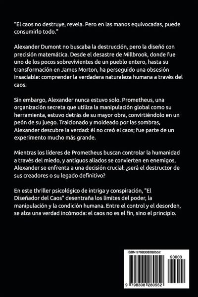 Sinopsis El caos no destruye, revela la verdad. Pero para quienes intentan controlarlo, la verdad puede ser su mayor castigo. Alexander Dumont no buscaba la destrucción. La creó. Desde el desastre de Millbrook, donde se convirtió en uno de los pocos sobrevivientes, hasta su transformación en James Morton, ha diseñado catástrofes para desentrañar el caos y los secretos que oculta la humanidad. Pero incluso el diseñador más meticuloso puede ser manipulado. Prometheus, una organización que diseña desastres para moldear el mundo a su antojo, estuvo detrás de su obra más destructiva, convirtiéndolo en una herramienta sin que él lo supiera. Ahora, mientras las líneas entre control y caos se desdibujan, Alexander descubrirá que su mayor enemigo no está fuera de él, sino en las sombras que lo moldearon. En un mundo donde la humanidad se enfrenta a sus límites, donde el control es solo una ilusión, Alexander, Prometheus y aquellos que buscan venganza cruzarán caminos en una espiral de traiciones, revelaciones y destrucción. ¿Quiénes serán los verdaderos diseñadores del caos?