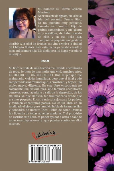 Mi libro se trata de una historia real, donde encontrarás de todo. Se trata de una mujer que vivió muchos años, EL DOLOR DE UN RECUERDO. Una mujer que fue maltratada, violada, humillada, pero que al final pudo romper todos los traumas que la envolvían, y hoy es una mujer nueva, diferente. En este libro encontrarás no solamente una historia más, sino también encontrarás consejos, como ayudarte a salir de la depresión, de los traumas, ya que Daniela, fue traumatizada desde que era muy pequeña. Encontrarás consejos para los padres, y también encontrarás poesía. No es un libro en su totalidad religioso, pero también habla de las maravillas y bondades de nuestro Dios. Habla de cómo Daniela fue liberada de todas aquellas ataduras. Y el propósito de escribir este libro, es poder ayudar a otros a salir de todas esas depresiones y que puedan confiar en ellos mismos.