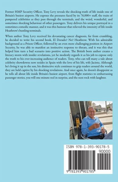 Former HMP Security Officer, Tony Levy reveals the shocking truth of life inside one of Britain's busiest airports. He exposes the pressures faced by its 76,000+ staff, the traits of pampered celebrities as they pass through the terminals, and the weird, wonderful, and sometimes shocking behaviour of other passengers. Tony delivers his unique portrayal in a sometimes comedic manner, and it was this humour that relieved the intensity of life inside Heathrow's bustling terminals. When author Tony Levy received his devastating cancer diagnosis, far from crumbling, he decided to write his second book, El Dorado? No! Heathrow. With his admirable background as a Prison Officer, followed by an even more challenging position in Airport Security, he was able to manifest an instinctive response to threats, and it was this that helped him turn a bad scenario into positive action. The British born author creates a literary storm with insider revelations, yet he modestly regards it as his job to expose only the truth to his ever-increasing audience of readers. Tony, who can tell many a tale about celebrity showdowns now resides in Spain with the love of his life, wife Jacinta. Although he's living it up in the sun, his distinctive style continues to grip readers around the world, they are held captive by his shocking revelations. And once again, he doesn't disappoint as he tells all about life inside Britain's busiest airport, from flight statistics to embarrassing passenger stories, you will one minute reel in surprise, and the next rock with laughter.