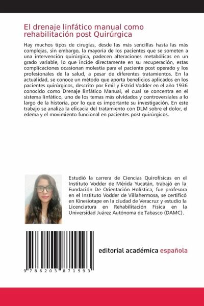 Hay muchos tipos de cirugías, desde las más sencillas hasta las más complejas, sin embargo, la mayoría de los pacientes que se someten a una intervención quirúrgica, padecen alteraciones metabólicas en un grado variable, lo que incide directamente en su recuperación, estas complicaciones ocasionan molestia para el paciente post operado y los profesionales de la salud, a pesar de diferentes tratamientos. En la actualidad, se conoce un método que aporta beneficios aplicados en los pacientes quirúrgicos, descrito por Emil y Estrid Vodder en el año 1936 conocido como Drenaje linfático Manual, el cual se concentra en el sistema linfático, uno de los temas más olvidados y controversiales a lo largo de la historia, por lo que es importante su investigación. En este trabajo se analiza la eficacia del tratamiento con DLM sobre el dolor, el edema y el movimiento funcional en pacientes post quirúrgicos.