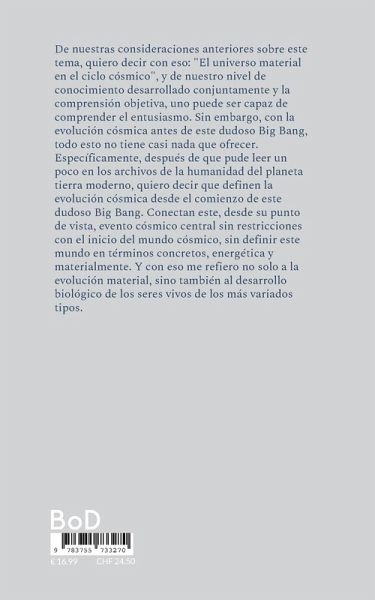 De nuestras consideraciones anteriores sobre este tema, quiero decir con eso: "El universo material en el ciclo cósmico", y de nuestro nivel de conocimiento desarrollado conjuntamente y la comprensión objetiva, uno puede ser capaz de comprender el entusiasmo. Sin embargo, con la evolución cósmica antes de este dudoso Big Bang, todo esto no tiene casi nada que ofrecer. Específicamente, después de que pude leer un poco en los archivos de la humanidad del planeta tierra moderno, quiero decir que definen la evolución cósmica desde el comienzo de este dudoso Big Bang. Conectan este, desde su punto de vista, evento cósmico central sin restricciones con el inicio del mundo cósmico, sin definir este mundo en términos concretos, energética y materialmente. Y con eso me refiero no solo a la evolución material, sino también al desarrollo biológico de los seres vivos de los más variados tipos.