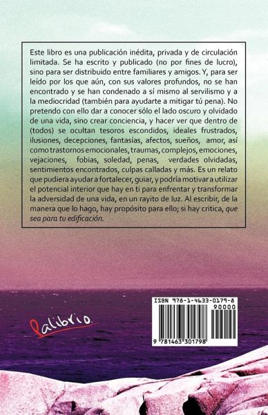 Este libro es una publicación inédita, privada y de circulación limitada. Se ha escrito y publicado (no por fines de lucro), sino para ser distribuido entre familiares y amigos. Y, para ser leído por los que aun, con sus valores profundos, no se han encontrado y se han condenado a sí mismo al servilismo y a la mediocridad (también para ayudarte a mitigar tú pena). No pretendo con ello dar a conocer sólo el lado oscuro y olvidado de una vida, sino crear conciencia, y hacer ver que dentro de (todos) se ocultan tesoros escondidos, ideales frustrados, ilusiones, decepciones, fantasías, afectos, sueños, amor, así como trastornos emocionales, traumas, complejos, emociones, vejaciones, fobias, soledad, penas, verdades olvidadas, sentimientos encontrados, culpas calladas y más. Es un relato que pudiera ayudar a fortalecer, guiar, y podría motivar a utilizar el potencial interior que hay en ti para enfrentar y transformar la adversidad de una vida, en un rayito de luz. Al escribir, de la manera que lo hago, hay propósito para ello; si hay critica, que sea para tu edificación.