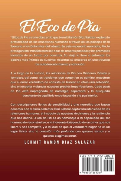 ¿Y si amar también significa aprender a soltar? En las colinas doradas de la Toscana, Pía busca algo más que un nuevo paisaje: busca reconstruirse. Tras una ruptura que le deja el alma en ruinas, Pía viaja por Italia huyendo de los silencios de su pasado. Pero entre los puentes de Florencia y los aromas de un café olvidado, descubre que las verdaderas respuestas no siempre están en otros... sino en lo que ha estado evitando sentir. "El Eco de Pía" es una novela íntima, honesta y profundamente emocional sobre lo que significa amar, perder y reencontrarse con una misma. ¿ Una historia para mujeres que alguna vez se sintieron rotas. ¿ Un viaje para quienes aún creen en la belleza de sanar desde dentro. ¿Qué encontrarás en estas páginas? Un viaje sensorial por Italia que entrelaza paisajes, aromas y silencios con los fragmentos del alma de una mujer en reconstrucción. Pía no es solo un personaje: es el reflejo de todas aquellas que han amado, perdido y encontrado en el camino la fuerza para volver a empezar. Esta novela es para quienes se emocionan con las historias de Isabel Allende, disfrutan la intimidad narrativa de Alice Kellen, y valoran el detalle atmosférico de Carlos Ruiz Zafón. El Eco de Pía dialoga con esas voces, pero con un alma propia que resuena en cada página. Descubre una historia que te hará pensar, sentir y, quizá, sanar. Reseña destacada: "Una lectura que transmite calma e invita a la introspección. A través de personajes auténticos y una narrativa rica, El Eco de Pía nos sumerge en una historia íntima que resuena incluso después de haber cerrado el libro".