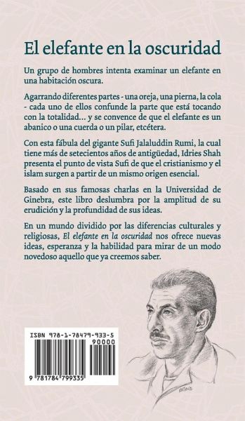 Un grupo de hombres intenta examinar un elefante en una habitación oscura. Agarrando diferentes partes – una oreja, una pierna, la cola – cada uno de ellos confunde la parte que está tocando con la totalidad… y se convence de que el elefante es un abanico o una cuerda o un pilar, etcétera. Con esta fábula del gigante Sufi Jalaluddin Rumi, la cual tiene más de setecientos años de antigüedad, Idries Shah presenta el punto de vista Sufi de que la cristianismo y el islam surgen a partir de un mismo origen esencial. Basado en sus famosas charlas en la Universidad de Ginebra, este libro deslumbra por la amplitud de su erudición y la profundidad de sus ideas. En un mundo dividido por las diferencias culturales y religiosas, El elefante en la oscuridad nos ofrece nuevas ideas, esperanza y la habilidad para mirar de un modo novedoso aquello que ya creemos saber.