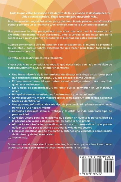 Todo lo que estás buscando está dentro de ti... y cuando lo desbloquees, tu vida cobrará sentido. Sigue leyendo para descubrir más... Buscas conexión, seguridad, amor, paz y plenitud. Puede parecer una afirmación audaz, pero eres un ser humano y, en el fondo, esto es lo que todos deseamos. Nos pasamos la vida persiguiendo una cosa tras otra con la esperanza de encontrar finalmente lo que buscamos... pero la verdad es que hasta que no te conozcas a ti mismo, nunca encontrarás la plenitud que estás buscando. Cuando comiences a vivir de acuerdo a tu verdadero ser, el mundo se plegará a tu voluntad... porque sabrás exactamente qué hacer para lograr todo lo que deseas en tu corazón. Se trata de descubrir quién eres realmente. No se trata de buscar rasgos superficiales ni de intentar manifestar tus deseos de la nada... Se trata de liberar tu verdadero potencial, y eso es posible independientemente de cómo sea tu pasado y de cuál sea tu situación actual. El arma secreta que tienes a tu disposición es el Eneagrama, un sistema de clasificación de personalidades que considera cada personalidad como un cóctel determinado a partir de nueve tipos de personalidades interconectadas. El uso del Eneagrama te dará una visión más profunda de tu propia personalidad... y a partir de ahí, podrás descubrir lo que te motiva, lo que te desafía y lo que realmente deseas. Puede parecer desalentador, pero al tener la orientación adecuada, no es nada tan complicado como una llave para abrir tu verdadero ser. Y esta guía clara y completa, es todo lo que necesitarás a tu lado en tu viaje de autodescubrimiento. En su interior encontrarás: Una breve historia de la herramienta del Eneagrama -llega a sus raíces para que entiendas cómo funciona... y luego descubre cómo utilizarlo El compromiso esencial que debes asumir contigo mismo para descubrir quién eres realmente Los 9 tipos de personalidad... y las "alas" que te convierten en un individuo único Por qué el autoconocimiento es fundamental - y cómo cultivarlo Cómo descubrir tu mayor maestro (pista: es tu pasión, y todo lo que necesitas hacer es identificarla) Una guía en profundidad de cada tipo de personalidad - piensa en esto como tu hoja de ruta hacia ti mismo Consejos esenciales sobre el trabajo y el estilo de vida para cada tipo de personalidad Consejos únicos para las relaciones que tienen en cuenta la personalidad de la persona con la que estás en pareja, así como la tuya propia Afirmaciones diseñadas específicamente para tu personalidad que podrás utilizar cada día para ayudarte a elaborar la vida de tus sueños Ejercicios prácticos que te ayudarán a obtener una verdadera comprensión de ti mismo y de tu personalidad ...y mucho más. Si sientes que sin importar lo que intentes, la vida no parece funcionar como esperabas, seguir persiguiendo cosas nuevas no es la respuesta. Pero la esperanza está a la vuelta de la esquina: Todos podemos liberar todo nuestro potencial y vivir una vida que nos brinde paz, plenitud y abundancia... Sólo tienes que mirar dentro de ti y entender lo que estás viendo. Estás a un clic de conseguir la información que te ayudará a hacerlo... Descubre tu verdadera identidad y ponte en marcha para vivir la vida de tus sueños: Desplázate hacia arriba y haz clic en "Añadir al carro" ahora mismo.