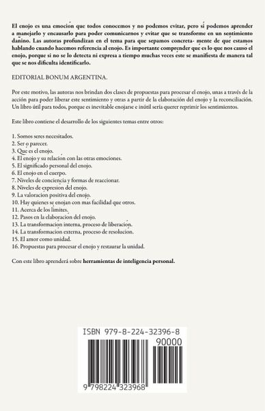 El enojo es una emociön que todos conocemos y no podemos evitar, pero si¿ podemos aprender a manejarlo y encausarlo para poder comunicarnos y evitar que se transforme en un sentimiento dan¿ino. Las autoras profundizan en el tema para que sepamos concreta- mente de que¿ estamos hablando cuando hacemos referencia al enojo. Es importante comprender que¿ es lo que nos causö el enojo, porque si no se lo detecta ni expresa a tiempo muchas veces e¿ste se manifiesta de manera tal que se nos dificulta identificarlo. EDITORIAL BONUM ARGENTINA. Por este motivo, las autoras nos brindan dos clases de propuestas para procesar el enojo, unas a través de la acción para poder liberar este sentimiento y otras a partir de la elaboración del enojo y la reconciliación. Un libro útil para todos, porque es inevitable enojarse e inútil sería querer reprimir los sentimientos. Este libro contiene el desarrollo de los siguientes temas entre otros: 1. Somos seres necesitados. 2. Ser o parecer. 3. Que¿ es el enojo. 4. El enojo y su relaciön con las otras emociones. 5. El significado personal del enojo. 6. El enojo en el cuerpo. 7. Niveles de conciencia y formas de reaccionar. 8. Niveles de expresiön del enojo. 9. La valoraciön positiva del enojo. 10. Hay quienes se enojan con mäs facilidad que otros. 11. Acerca de los li¿mites. 12. Pasos en la elaboraciön del enojo. 13. La transformaciön interna, proceso de liberaciön. 14. La transformaciön externa, proceso de resoluciön. 15. El amor como unidad. 16. Propuestas para procesar el enojo y restaurar la unidad. Con este libro aprenderá sobre herramientas de inteligencia personal.