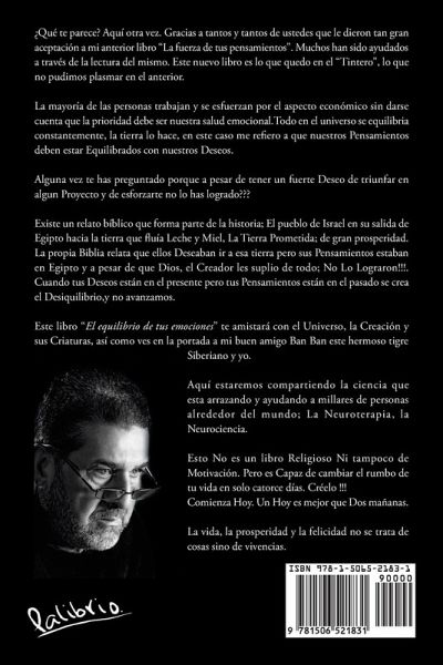 ¿Qué te parece? Aquí otra vez. Gracias a tantos y tantos de ustedes que le dieron tan gran aceptación a mi anterior libro "La fuerza de tus pensamientos". Muchos han sido ayudados a través de la lectura del mismo. Este nuevo libro es lo que quedo en el "Tintero", lo que no pudimos plasmar en el anterior. La mayoría de las personas trabajan y se esfuerzan por el aspecto económico sin darse cuenta que la prioridad debe ser nuestra salud emocional.Todo en el universo se equilibria constantemente, la tierra lo hace, en este caso me refiero a que nuestros Pensamientos deben estar Equilibrados con nuestros Deseos. Alguna vez te has preguntado porque a pesar de tener un fuerte Deseo de triunfar en algun Proyecto y de esforzarte no lo has logrado??? Existe un relato bíblico que forma parte de la historia; El pueblo de Israel en su salida de Egipto hacia la tierra que fluía Leche y Miel, La Tierra Prometida; de gran prosperidad. La propia Biblia relata que ellos Deseaban ir a esa tierra pero sus Pensamientos estaban en Egipto y a pesar de que Dios, el Creador les suplio de todo; No Lo Lograron!!!.Cuando tus Deseos están en el presente pero tus Pensamientos están en el pasado se crea el Desiquilibrio,y no avanzamos. Este libro "El equilibrio de tus emociones" te amistará con el Universo, la Creación y sus Criaturas, así como ves en la portada a mi buen amigo Ban Ban este hermoso tigre Siberiano y yo. Aquí estaremos compartiendo la ciencia que esta arrazando y ayudando a millares de personas alrededor del mundo; La Neuroterapia, la Neurociencia. Esto No es un libro Religioso Ni tampoco de Motivación. Pero es Capaz de cambiar el rumbo de tu vida en solo catorce días. Créelo !!! Comienza Hoy. Un Hoy es mejor que Dos mañanas. La vida, la prosperidad y la felicidad no se trata de cosas sino de vivencias.
