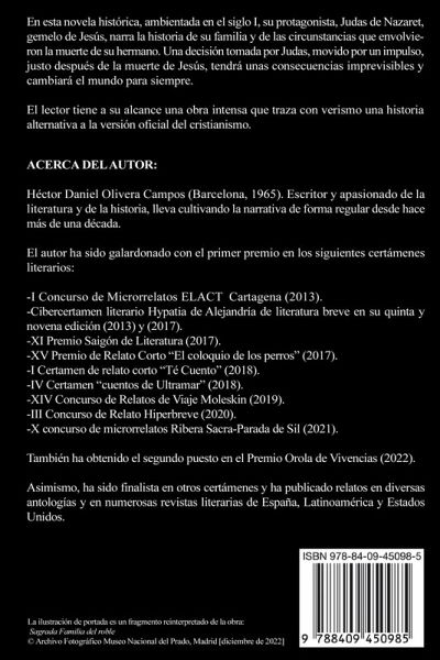 En esta novela histórica, ambientada en el siglo I, su protagonista, Judas de Nazaret, gemelo de Jesús, narra la historia de su familia y de las circunstancias que envolvieron la muerte de su hermano. Una decisión tomada por Judas, movido por un impulso, justo después de la muerte de Jesús, tendrá unas consecuencias imprevisibles y cambiará el mundo para siempre.El lector tiene a su alcance una obra intensa que traza con verismo una historia alternativa a la versión oficial del cristianismo.