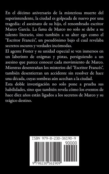 En el décimo aniversario de la misteriosa muerte del superintendente, la ciudad es golpeada de nuevo por una tragedia: el asesinato de su hijo, el renombrado escritor Marco García. La fama de Marco no solo se debe a su talento literario, sino también a su alter ego como el "Escritor Francés", un pseudónimo bajo el cual revelaba secretos oscuros y verdades incómodas. El agente Foster y su unidad especial se ven inmersos en un laberinto de enigmas y pistas, persiguiendo a un asesino que parece conocer cada movimiento de Marco. Mientras desentrañan los misterios del "Escritor Francés", también desentierran un accidente sin resolver de hace una década, cuyas sombras aún acechan a la ciudad. Esta doble investigación no solo pone a prueba sus habilidades, sino que también revela cómo los eventos de hace diez años están ligados a los secretos de Marco y su trágico destino.