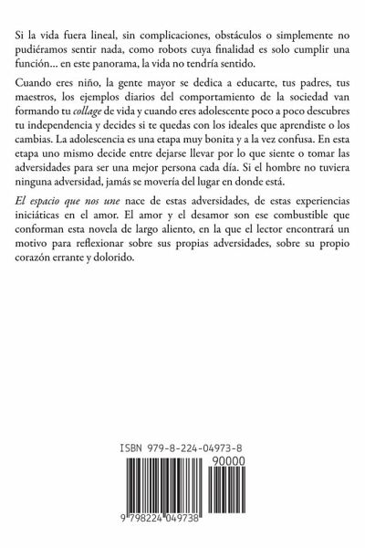 Si la vida fuera lineal, sin complicaciones, obstáculos o simplemente no pudiéramos sentir nada, como robots cuya finalidad es solo cumplir una función... en este panorama, la vida no tendría sentido. Cuando eres niño, la gente mayor se dedica a educarte, tus padres, tus maestros, los ejemplos diarios del comportamiento de la sociedad van formando tu collage de vida y cuando eres adolescente poco a poco descubres tu independencia y decides si te quedas con los ideales que aprendiste o los cambias. La adolescencia es una etapa muy bonita y a la vez confusa. En esta etapa uno mismo decide entre dejarse llevar por lo que siente o tomar las adversidades para ser una mejor persona cada día. Si el hombre no tuviera ninguna adversidad, jamás se movería del lugar en donde está. El espacio que nos une nace de estas adversidades, de estas experiencias iniciáticas en el amor. El amor y el desamor son ese combustible que conforman esta novela de largo aliento, en la que el lector encontrará un motivo para reflexionar sobre sus propias adversidades, sobre su propio corazón errante y dolorido.