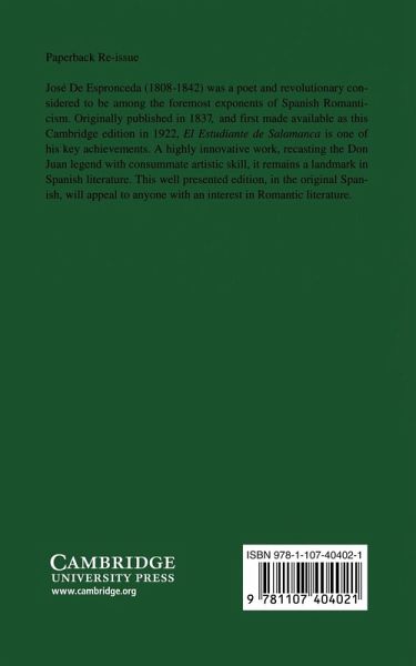 José De Espronceda (1808-42) was a poet and revolutionary considered to be among the foremost exponents of Spanish Romanticism. Originally published in 1837, and first made available as this Cambridge edition in 1922, El Estudiante de Salamanca is one of his key achievements. A highly innovative work, recasting the Don Juan legend with consummate artistic skill, it remains a landmark in Spanish literature. This well presented edition, in the original Spanish, will appeal to anyone with an interest in Romantic literature.