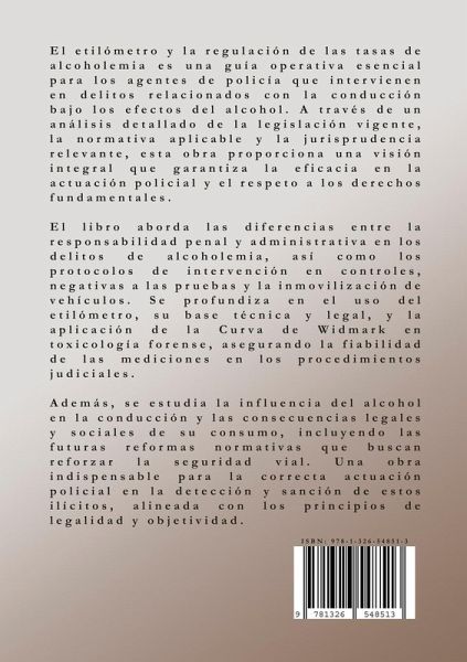El etilómetro y la regulación de las tasas de alcoholemia es una guía operativa esencial para los agentes de policía que intervienen en delitos relacionados con la conducción bajo los efectos del alcohol. A través de un análisis detallado de la legislación vigente, la normativa aplicable y la jurisprudencia relevante, esta obra proporciona una visión integral que garantiza la eficacia en la actuación policial y el respeto a los derechos fundamentales. El libro aborda las diferencias entre la responsabilidad penal y administrativa en los delitos de alcoholemia, así como los protocolos de intervención en controles, negativas a las pruebas y la inmovilización de vehículos. Se profundiza en el uso del etilómetro, su base técnica y legal, y la aplicación de la Curva de Widmark en toxicología forense, asegurando la fiabilidad de las mediciones en los procedimientos judiciales. Además, se estudia la influencia del alcohol en la conducción y las consecuencias legales y sociales de su consumo, incluyendo las futuras reformas normativas que buscan reforzar la seguridad vial. Una obra indispensable para la correcta actuación policial en la detección y sanción de estos ilícitos, alineada con los principios de legalidad y objetividad.
