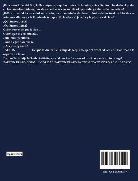 ¡Hermosas hijas del Sol, bellas náyades, a quien ninfas de fuentes y ríos Neptuno ha dado el poder en los minados cristales, que de su centro se ven anhelando por salir y anhelando por volver! ¡Bellas hijas del Aurora, dulces dríades, en quien ninfas de flores y frutos depositó el rosicler de sus primeros albores en la iluminada tez, que dio la nieve al jazmín y la púrpura al clavel! ¿Quién nos busca? ¿Quién nos llama? Quien pretende que le deis... Quien que le deis solicita... ...un felice parabién. ...una alegre norabuena. ¿De qué, sepamos? FAETÓN De que la divina Tetis, hija de Neptuno, que el dosel tal vez de nácar trocó a la copa de un laurel. De que Tetis, hija bella de Anfitrite, que tal vez trocó su nevado alcázar a este divino vergel. FAETÓN EPAFO CORO 1.º CORO 2.º FAETÓN EPAFO FAETÓN EPAFO CORO 1.º Y 2.º EPAFO