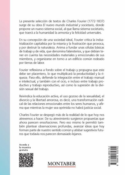La presente selección de textos de Charles Fourier (1772-1837) surge de su obra El nuevo mundo industrial y societario, donde propone un nuevo sistema social, al que llama sistema societario, que traerá a la humanidad la armonía y la felicidad universales. En su concepción de una sociedad ideal, Fourier critica la industrialización capitalista por la miseria y la frustración que provoca, y por destruir la naturaleza. Anima a fundar unas células básicas de trabajo y de vida, que denomina falansterios, y que debían tener en cuenta las necesidades materiales y emocionales de sus miembros, y organizarse en torno a un edificio común rodeado por tierras de labor. Fourier reflexiona a fondo sobre el trabajo y propugna que este debe ser placentero, lo que multiplicará la productividad y la riqueza. Para ello, defiende la integración entre el trabajo manual e intelectual, y también con el ocio, e incluso entre trabajo productivo y trabajo reproductivo, así como la supresión de la división sexual del trabajo. Reivindica la educación activa, el uso gozoso de la sexualidad, el divorcio y la libertad amorosa, es decir, una transformación radical de las relaciones emocionales entre los seres humanos, y afirma que mientras la mujer sea oprimida no habrá justicia social. Charles Fourier se despegó más de la realidad de lo que hoy nos atrevemos a hacer. De su atrevimiento surgieron propuestas que ahora parecen ensoñaciones. Pero eso mismo le permitió también plantear observaciones profundas, avanzar ideas que hoy forman parte de nuestro sentido común y atisbar sugestivos futuros que todavía nos parecen demasiado lejanos.