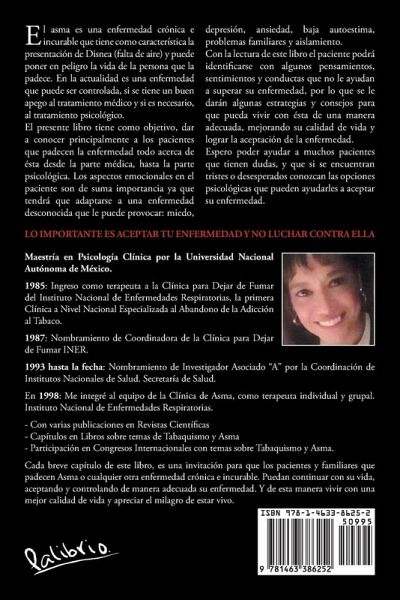 El asma es una enfermedad crónica e incurable que tiene como característica la presentación de Disnea (falta de aire) y puede poner en peligro la vida de la persona que la padece. En la actualidad es una enfermedad que puede ser controlada, si se tiene un buen apego al tratamiento médico y si es necesario al tratamiento psicológico. El presente libro tiene como objetivo, dar a conocer principalmente a los pacientes que padecen la enfermedad todo acerca de ésta desde la parte médica, hasta la parte psicológica. Los aspectos emocionales en el paciente son de suma importancia ya que tendrá que adaptarse a una enfermedad desconocida que le puede provocar, miedo, depresión, ansiedad, baja autoestima, problemas familiares y aislamiento. Con la lectura de este libro el paciente podrá identificarse con algunos pensamientos, sentimientos y conductas que no le ayudan a superar su enfermedad, por lo que se le darán algunas estrategias y consejos para que pueda vivir con su enfermedad de una manera adecuada, mejorando su calidad de vida y lograr la aceptación de la enfermedad. Espero poder ayudar a muchos pacientes que tienen dudas de su enfermedad y que si se encuentran tristes o desesperados conozcan las opciones psicológicas que pueden ayudarles a aceptar su enfermedad. LO IMPORTANTE ES ACEPTAR TU ENFERMEDAD Y NO LUCHAR CONTRA ELLA