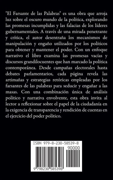 "El Farsante de las Palabras" es una obra que arroja luz sobre el oscuro mundo de la política, explorando las promesas incumplidas y las falacias de los líderes gubernamentales. A través de una mirada penetrante y crítica, el autor desentraña los mecanismos de manipulación y engaño utilizados por los políticos para obtener y mantener el poder. Con un enfoque narrativo el libro examina las promesas vacías y discursos grandilocuentes que han marcado la política contemporánea. Desde campañas electorales hasta debates parlamentarios, cada página revela las artimañas y estrategias retóricas empleadas por los farsantes de las palabras para seducir y engañar a las masas. Con una combinación única de análisis político y narrativa envolvente, esta obra invita al lector a reflexionar sobre el papel de la ciudadanía en la exigencia de transparencia y rendición de cuentas en el ejercicio del poder político.