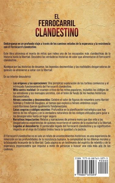 Embárquese en un profundo viaje a través de los caminos velados de la esperanza y la resistencia con El Ferrocarril clandestino. Este libro atraviesa el manto de mitos que rodea una de las escapadas más clandestinas de la historia hacia la libertad. Descubra las verdaderas historias de valor que alimentaron el Ferrocarril clandestino. Navegue por las historias de desamor, las leyendas desmentidas y las realidades desgarradoras de quienes se atrevieron a soñar con la libertad. En su interior descubrirá: Los orígenes y las operaciones: Una perspicaz exploración de los turbios comienzos y el intrincado funcionamiento del Ferrocarril clandestino. Mito contra realidad: Un examen crítico de los mitos populares, incluidos los códigos de los edredones y los mensajes secretos, con el telón de fondo de los hechos históricos documentados. Héroes conocidos y desconocidos: Celebre el valor de figuras de renombre como Harriet Tubman y Frederick Douglass, al tiempo que explora a héroes anónimos cuyas contribuciones fueron igualmente fundamentales. Casas seguras y códigos secretos: Profundice en la planificación estratégica que hay detrás de los refugios y en la verdadera naturaleza de los códigos utilizados para guiar a los desesperados hasta un lugar seguro. Narrativas impactantes: Relatos y narraciones de primera mano que dan vida a las desgarradoras experiencias de quienes recorrieron el camino de la esclavitud a la libertad. Legados al descubierto: El perdurable legado del Ferrocarril clandestino y su significativo impacto en el viaje de Estados Unidos hacia la igualdad y la justicia. El Ferrocarril clandestino no es solo un relato de acontecimientos históricos; es una experiencia de inmersión en las profundidades de la resistencia humana, la complejidad de los dilemas morales y la búsqueda incesante de la libertad. Cada página es un testimonio del espíritu de rebeldía y de la esperanza imperecedera que impulsó a miles de personas a buscar una vida más allá de las cadenas.