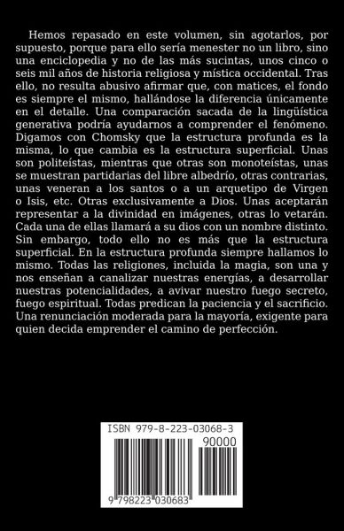 Hemos repasado en este volumen, sin agotarlos, por supuesto, porque para ello sería menester no un libro, sino una enciclopedia y no de las más sucintas, unos cinco o seis mil años de historia religiosa y mística occidental. Tras ello, no resulta abusivo afirmar que, con matices, el fondo es siempre el mismo, hallándose la diferencia únicamente en el detalle. Una comparación sacada de la lingüística generativa podría ayudarnos a comprender el fenómeno. Digamos con Chomsky que la estructura profunda es la misma, lo que cambia es la estructura superficial. Unas son politeístas, mientras que otras son monoteístas, unas se muestran partidarias del libre albedrío, otras contrarias, unas veneran a los santos o a un arquetipo de Virgen o Isis, etc. Otras exclusivamente a Dios. Unas aceptarán representar a la divinidad en imágenes, otras lo vetarán. Cada una de ellas llamará a su dios con un nombre distinto. Sin embargo, todo ello no es más que la estructura superficial. En la estructura profunda siempre hallamos lo mismo. Todas las religiones, incluida la magia, son una y nos enseñan a canalizar nuestras energías, a desarrollar nuestras potencialidades, a avivar nuestro fuego secreto, fuego espiritual. Todas predican la paciencia y el sacrificio. Una renunciación moderada para la mayoría, exigente para quien decida emprender el camino de perfección.