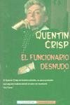 Quentin Crisp, fallecido en 1999 a la edad de noventaiún años ha sido uno de los más finos humoristas ingleses de los últimos tiempos. Su prosa limpia, inteligente y de frase brillante, hereda el talento epigramático de Wilde y Bernard Shaw, a la vez que se constituye en irónica reconstrucción documental de un mundo, el del viejo siglo XX, que en algunos aspectos es ya tan distinto del nuestro como lo fueran el Renacimiento o el Siglo de las Luces. Con el descaro propio de quien nada tiene que ganar ni que perder, Crisp encarna una cruzada de un solo hombre a favor de sí mismo. Su coraje queda patente cuando, aún muy joven, en los poco tolerantes años treinta, decide ignorar las convenciones sociales y mostrarse públicamente tal y como se sentía, un excéntrico personaje de gestos afeminados y conversación chispeante. Vestido con trajes de terciopelo y colores chillones, el pelo largo y teñido de rojo, se pasea por la vía pública con exagerados ademanes femeninos. En aquellos primeros años hubo de sufrir insultos, golpes y amenazas sin cuento, además de pasar por la cárcel y perder el respeto de familiares y amigos. El funcionario desnudo, primer volumen de sus memorias, es una crónica autobiográfica que recoge precisamente aquellos años, salpicados de anécdotas, que Crisp narra con gracia inimitable, en un tono agridulce y recurriendo a menudo a un sano y balsámico cinismo. Por sus páginas desfilan personas y personajes, miembros de la peculiar fauna de la bohemia londinense de antes y después de la II Guerra Mundial, desde completos desconocidos hasta ilustres y extravagantes artistas, como Mervin Peake y Colin Wilson.