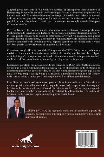 Al igual que la teoría de la relatividad de Einstein, el principio de incertidumbre de Heisenberg, la ecuación de onda de Schrödinger fascina a las mentes inquisitivas y a los amantes de la física desde hace mucho tiempo. A medida que la física se adentra cada vez más, surgen más preguntas. La energía oscura, la antimateria, el universo paralelo, el entrelazamiento cuántico, etc., son conceptos complicados de física para el hombre común. Pero la física y la poesía, ambas son expresiones internas y más profundas, explicaciones de la naturaleza. La física y la poesía se complementan mutuamente. Ni la física puede explicar todo sobre la naturaleza, la verdad y la realidad, ni la poesía puede describir la naturaleza, la verdad y la realidad a través de nuestras emociones. Desde el comienzo de la poesía moderna, algunos científicos y estudiantes de ciencias escriben poesía para enriquecer el mundo de la literatura. Cuando se otorgó el Premio Nobel de Física para el año 2022 a físicos por experimentos en física cuántica, me alentó a fusionar la física y la poesía y escribir este libro "El gato de Schrödinger". La repentina partida de mi amada esposa de este planeta también me llevó a alturas emocionales y me obligó a refugiarme en la poesía. Esperamos que algún día la física descubra la ecuación de Dios y la verdad fundamental de por qué y cómo el universo llegó a existir, cuál es el propósito de la existencia de nuestro universo y de nuestras vidas. Ya sea que el universo provenga de algo o de la nada, del big bang o sin big bang, y su realidad o ilusión en el dominio del tiempo, toda verdad saldrá a la luz, pero puede que no esté en el dominio del tiempo. Este libro de poesía está compuesto para explicar la naturaleza y la física de una manera poética y sencilla para todos, ya que la mayoría de las personas piensa que ni la física ni la poesía son lo suyo. Cuando la física se vuelve confusa, la poesía puede hablar a su manera sobre la naturaleza y la realidad. Este libro también es un intento de fusión de la física con la poesía o de la poesía con la física.