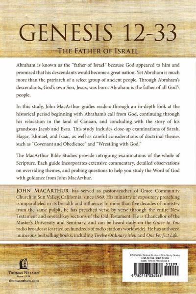 John MacArthur takes readers through Genesis 12â 33, exploring the historical period beginning with Abrahamâ s call from God, continuing through his relocation to Canaan, and concluding with the story of his grandsons Jacob and Esau. This study can be used for personal reflection or for use in a small-group setting.