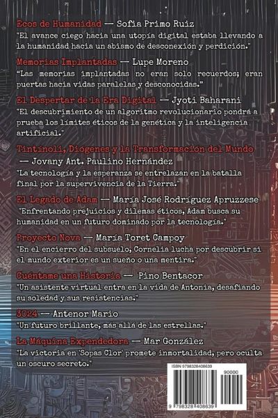 Colección Literaria "Alas de Papel" Vol. 1 Amanece una nueva era a medida que comienza un nuevo milenio, la humanidad se encuentra en el umbral de su próxima gran evolución. No se trata de un cambio dictado por el azar o por fuerzas naturales, sino por el ingenio humano y la sed insaciable de trascender nuestros propios límites. "El genoma del futuro" es una exploración de este próximo salto, en un mundo donde la línea entre lo orgánico y lo artificial se desvanece, dando lugar a una realidad antes inimaginable. Esta antología no es solo una colección de cuentos; Es un tapiz tejido con los hilos de las posibilidades futuras. Cada narrativa es una ventana a un mundo donde la inteligencia artificial no solo complementa nuestra existencia, sino que se entrelaza con ella hasta el punto de una simbiosis perfecta. Donde la tecnología no sea una herramienta, sino una compañera, una constructora de sueños y una catalizadora de destinos. En este viaje, nos embarcaremos más allá de los límites de nuestra época. Donde mentes curiosas buscan desafiar lo que es posible. Desde las grandes ciudades alimentadas por la energía estelar hasta los rincones de la conciencia digital, exploramos los límites de la imaginación humana. Donde los avances en la genética y la inteligencia artificial redefinirán la idea de lo que es ser humano. Déjate llevar por esta colección de relatos y descubre los desafíos que enfrentaran los protagonistas. Cada historia es un paso para comprender nuestro destino compartido. Aquí encontrarás tanto advertencias como promesas sobre el porvenir. Recuerda que, aunque el futuro aún no está escrito, tenemos el poder de darle forma. Bienvenido a esta odisea de la humanidad. Prepárate para explorar lo desconocido. RELATOS Y AUTORES 1. Ecos de Humanidad - Sofia Primo Ruiz "El avance ciego hacia una utopía digital estaba llevando a la humanidad hacia un abismo de desconexión y perdición." 2. Memorias Implantadas - Lupe Moreno "Las memorias implantadas no eran solo recuerdos; eran puertas hacia vidas paralelas y desconocidas." 3. El Despertar de la Era Digital - Jyoti Baharani "El descubrimiento de un algoritmo revolucionario pondrá a prueba los límites éticos de la genética y la inteligencia artificial." 4. Tintínoli, Diógenes y la Transformación del Mundo - Jovany Ant. Paulino Hernández "La tecnología y la esperanza se entrelazan en la batalla final por la supervivencia de la Tierra." 5. El Legado de Adam - María José Rodríguez Apruzzese "Enfrentando prejuicios y dilemas éticos, Adam busca su humanidad en un futuro dominado por la tecnología." 6. Proyecto Nova - María Toret Campoy "En el encierro del subsuelo, Cornelia lucha por descubrir si el mundo exterior es un sueño o una mentira." 7. Cuéntame una Historia - Pino Bentacor "Un asistente virtual entra en la vida de Antonia, desafiando su soledad y sus resistencias." 8. 3024 - Antenor Mario "Un futuro brillante, más allá de las estrellas." 9. La Máquina Expendedora - Mar González "La victoria en 'Sopas Clor' promete inmortalidad, pero oculta un oscuro secreto." Libro benéfico