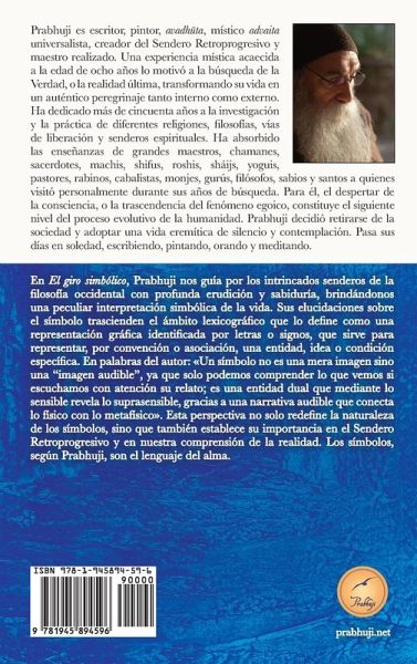 En El giro simbólico, Prabhuji nos guía por los intrincados senderos de la filosofía occidental con profunda erudición y sabiduría, brindándonos una peculiar interpretación simbólica de la vida. Sus elucidaciones sobre el símbolo trascienden el ámbito lexicográfico que lo define como una representación gráfica identificada por letras o signos, que sirve para representar, por convención o asociación, una entidad, idea o condición específica. En palabras del autor: Un símbolo no es una mera imagen sino una "imagen audible", ya que solo podemos comprender lo que vemos si escuchamos con atención su relato; es una entidad dual que mediante lo sensible revela lo suprasensible, gracias a una narrativa audible que conecta lo físico con lo metafísico. Esta perspectiva no solo redefine la naturaleza de los símbolos, sino que también establece su importancia en el sendero Retroprogresivo y en nuestra comprensión de la realidad. Los símbolos, según Prabhuji, son el lenguaje del alma.