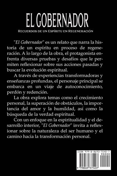 "El Gobernador" es un relato que narra la historia de un espíritu en proceso de regeneración. A lo largo de la obra, el protagonista enfrenta diversas pruebas y desafíos que le permiten reflexionar sobre sus acciones pasadas y buscar la evolución espiritual. A través de experiencias transformadoras y enseñanzas profundas, el personaje principal se embarca en un viaje de autoconocimiento, perdón y redención. La obra explora temas como el crecimiento personal, la superación de obstáculos, la importancia del amor y la humildad, así como la búsqueda de la verdad espiritual. Con un enfoque en la espiritualidad y el desarrollo interior, "El Gobernador" invita a reflexionar sobre la naturaleza del ser humano y el camino hacia la transformación personal.
