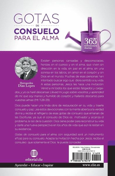 REFLEXIONES BREVES PARA CADA D¿¿A DEL A¿¿O Existen personas cansadas y desconsoladas, heridas en el cuerpo y en el alma, que viven sin direcci¿¿n en la vida, sin paz en el alma, sin una sonrisa en los labios, sin amor en el coraz¿¿n y sin Dios en el mundo. Muchas de esas personas han intentado buscar algo que les llenara o trajera alivio. A estas personas, Jes¿¿s les hace una invitaci¿¿n: Venid a m¿¿ todos los que est¿¿is fatigados y cargados, y yo os har¿¿ descansar. Llevad mi yugo sobre vosotros, y aprended de m¿¿, que soy manso y humilde de coraz¿¿n; y hallar¿¿is descanso para vuestras almas (Mt 11.28-29). Dios puede hacer una linda obra de restauraci¿¿n en su vida y traerle consuelo y paz. Lea estos devocionales con la mente abierta a la verdad divina y reciba el refrigerio de esas gotas de consuelo que emanan de las Escrituras, ya que el consuelo de Dios es algo exträ¿amente motivador, alcanza el amago del problema, la rä¿z de la cuesti¿¿n. El b¿¿lsamo divino tiene poder para reconstruir su vida y darle una nueva perspectiva en los ä¿os de vida que ä¿n le restan en su existencia. Gotas de consuelo para el alma, con seguridad ser¿¿ un instrumento eficaz para su consuelo. Acepte la invitaci¿¿n hecha por Jes¿¿s, reciba el alivio que solamente el Dios trino le puede conceder. Gotas de consuelo para el alma, con toda seguridad, ser¿¿ un instrumento eficaz para su consuelo. Acepta la invitaci¿¿n hecha por Jes¿¿s, recibe el consuelo que solamente Dios te puede conceder.