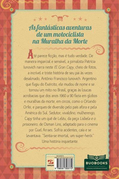 Até parece ficção, mas é tudo verdade. De maneira imparcial e sensível, a jornalista Patrícia Iunovich narra neste ¿El Gran Capy¿, cheio de fotos, a incrível e triste história de seu pai às vezes desalmado, Antônio Francisco Iunovich. Argentino que fugiu do Exército, ele mudou de nome e se tornou um mito no Brasil, graças às loucas acrobacias que dos anos 1960 a 90 fazia em globos e muralhas da morte, em circos, como o Orlando Orfei, e parques de diversão pelo país afora e pela América do Sul. Sedutor, vivaldino, mulherengo, Capy tinha um quê de Leléu, da peça Lisbela e o prisioneiro, de Osman Lins, adaptado para o cinema por Guel Arraes. Sofria acidentes, caía e se levantava. ¿Sentia-se imortal, um super-herói.¿ Uma história inquietante.