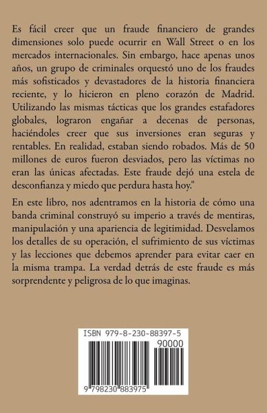 Es fácil creer que un fraude financiero de grandes dimensiones solo puede ocurrir en Wall Street o en los mercados internacionales. Sin embargo, hace apenas unos años, un grupo de criminales orquestó uno de los fraudes más sofisticados y devastadores de la historia financiera reciente, y lo hicieron en pleno corazón de Madrid. Utilizando las mismas tácticas que los grandes estafadores globales, lograron engañar a decenas de personas, haciéndoles creer que sus inversiones eran seguras y rentables. En realidad, estaban siendo robados. Más de 50 millones de euros fueron desviados, pero las víctimas no eran las únicas afectadas. Este fraude dejó una estela de desconfianza y miedo que perdura hasta hoy." En este libro, nos adentramos en la historia de cómo una banda criminal construyó su imperio a través de mentiras, manipulación y una apariencia de legitimidad. Desvelamos los detalles de su operación, el sufrimiento de sus víctimas y las lecciones que debemos aprender para evitar caer en la misma trampa. La verdad detrás de este fraude es más sorprendente y peligrosa de lo que imaginas.