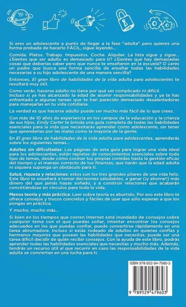 Si eres un adolescente a punto de llegar a la fase "adulta" pero quieres una forma probada de hacerlo FÁCIL, sigue leyendo... Comida. Platos. Trabajo. Impuestos. Coche. Alquiler. La lista sigue y sigue... ¿Sientes que ser adulto es demasiado para ti? ¿Sientes que hay demasiadas cosas que deberías saber pero que nunca te enseñaron en la escuela? O ¿eres un padre que busca una forma sencilla de enseñar todas las habilidades necesarias a su hijo adolescente de una manera sencilla? Entonces, El gran libro de habilidades de la vida adulta para adolescentes te resultará muy útil. Como verás, hacerse adulto no tiene por qué ser complicado ni difícil. Incluso si ya has alcanzado la edad de asumir responsabilidades y ya te has enfrentado a algunas tareas que te han parecido demasiado desalentadoras para manejarlas en tu vida cotidiana. La verdad es que hacerse adulto puede ser mucho más fácil de lo que crees. Con más de 10 años de experiencia en los campos de la educación y la crianza de sus hijos, Emily Carter te brinda una guía completa de todas las habilidades esenciales para la vida que necesitarás aprender como adolescente, sin tener que aprenderlas por las malas como la mayoría de la gente. En El gran libro de habilidades de la vida adulta para adolescentes, aprenderás sobre los siguientes temas... Adultez sin dificultadas: Las páginas de esta guía para lograr una vida ideal para los adolescentes, están repletas de conocimientos esenciales sobre todo tipo de temas, desde cómo cocinar tus propias comidas hasta la gestión eficaz del tiempo y el manejo correcto de tus finanzas, que harán que la edad adulta ni siquiera suponga un obstáculo para ti.Salud, riqueza y relaciones: estos son los tres grandes pilares de una vida feliz. Este libro te enseñará a tomar decisiones saludables, a ganar (¡y ahorrar!) más dinero del que jamás hayas soñado, y a construir relaciones que acabarán convirtiéndose en vínculos para toda la vida.Menos teoría y más práctica: Leer sobre teoría es aburrido. Por eso este libro te ofrece consejos y trucos concretos y fáciles de usar que sólo esperan a que los pongas en práctica.Y mucho, mucho más... Si bien en los tiempos que corren Internet está inundado de consejos sobre cualquier tema con el que puedas soñar, intentar encontrar los consejos adecuados en los que puedas confiar, puede convertirse rápidamente en una tarea abrumadora. Incluso si estás rodeado de adultos en quienes confías y hermanos mayores que poseen las habilidades que necesitas, puede ser una tarea difícil decidir de quién recibir consejos. Con la ayuda de este libro, podrás aprender todas las habilidades esenciales que necesitas y mucho más. Además, tendrás un recurso útil al que recurrir en caso las responsabilidades de la vida adulta se conviertan en una lucha para ti. Si estás listo para dar el primer paso hacia un futuro más brillante, ¡desplázate hacia arriba y consigue tu ejemplar ahora mismo!