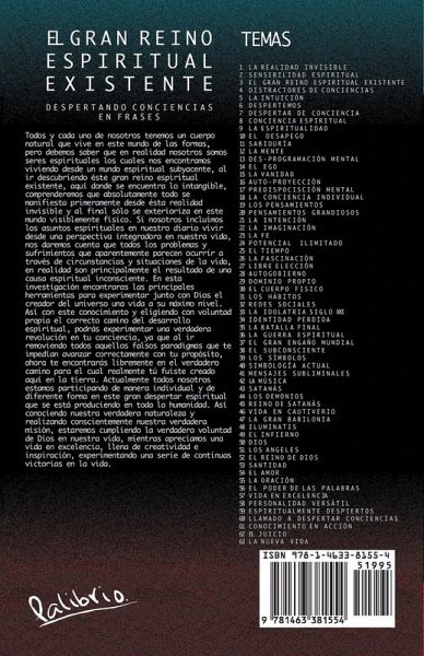 EL GRAN REINO ESPIRITUAL EXISTENTE DESPERTANDO CONSCIENCIAS EN FRASES Todos y cada uno de nosotros tenemos un cuerpo natural que vive en este mundo de las formas, pero debemos saber que en realidad nosotros somos seres espirituales los cuales nos encontramos viviendo desde un mundo espiritual subyacente, al ir descubriendo éste gran reino espiritual existente, aquí donde se encuentra lo intangible, comprenderemos que absolutamente todo se manifiesta primeramente desde ésta realidad invisible y al final sólo se exterioriza en este mundo visiblemente físico. Si nosotros incluimos los asuntos espirituales en nuestro diario vivir desde una perspectiva integradora en nuestra vida, nos daremos cuenta que todos los problemas y sufrimientos que aparentemente parecen ocurrir a través de circunstancias y situaciones de la vida, en realidad son principalmente el resultado de una causa espiritual inconsciente. En esta investigación encontraras las principales herramientas para experimentar junto con Dios el creador del universo una vida a su máximo nivel. Así con este conocimiento y eligiendo con voluntad propia el correcto camino del desarrollo espiritual, podrás experimentar una verdadera revolución en tu concencia, ya que al ir removiendo todos aquellos falsos paradigmas que te impedían avanzar correctamente con tu propósito, ahora te encontrarás libremente en el verdadero camino para el cual realmente tú fuiste creado aquí en la tierra. Actualmente todos nosotros estamos participando de manera individual y de diferente forma en este gran despertar espiritual que se está produciendo en toda la humanidad. Así conociendo nuestra verdadera naturaleza y realizando conscientemente nuestra verdadera misión, estaremos cumpliendo la verdadera voluntad de Dios en nuestra vida, mientras apreciamos una vida en excelencia, llena de creatividad e inspiración, experimentando una serie de continuas victorias en la vida.