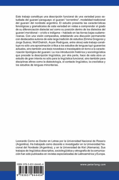 Este trabajo constituye una descripción funcional de una variedad poco estudiada del guaraní paraguayo: el guaraní «correntino», modalidad tradicional del guaraní del nordeste argentino. El estudio presenta las características fonológicas y gramaticales de esta variedad en vistas a comprender el grado de su diferenciación dialectal así como su posición dentro de los dialectos del guaraní meridional ¿ criollo e indígena ¿ hablado en las tierras bajas sudamericanas. Con una visión comparativa, entablando una discusión permanente con destacados autores de esta larga tradición de estudios (Emma Gregores y Jorge Suárez, Wolf Dietrich, Aryon Rodrigues, entre otros) este trabajo constituye no sólo una aproximación crítica a los estudios de lenguas tupí-guaraníes actuales, sino también una tesis novedosa e insoslayable en torno a la caracterización tipológica del guaraní. La rica introducción histórica y sociolingüística que precede la descripción lingüística, por otra parte, hace de esta obra un estudio de gran interés no sólo para la lingüística funcional, sino también para disciplinas afines como la dialectología, el contacto lingüístico, la creolística y los estudios de lenguas minoritarias.