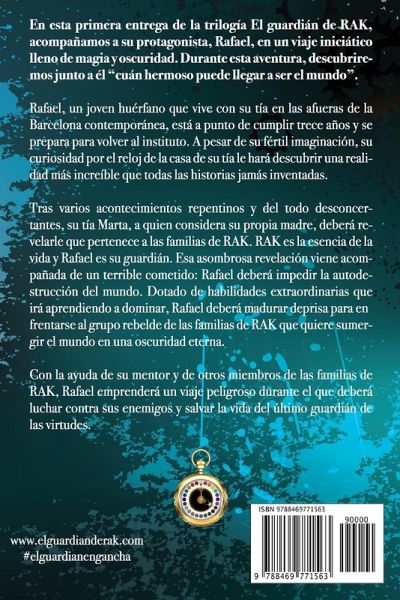 En esta primera entrega de la trilogía El guardián de RAK, acompañamos a su protagonista, Rafael, en un viaje iniciático lleno de magia y oscuridad. Durante esta aventura, descubriremos junto a él "cuán hermoso puede llegar a ser el mundo". ¿Cómo un joven de trece años puede tener tanta responsabilidad? Rafael, un joven huérfano que vive con su tía en las afueras de la Barcelona contemporánea, está a punto de cumplir trece años y se prepara para volver al instituto. A pesar de su fértil imaginación, su curiosidad por el reloj de la casa de su tía le hará descubrir una realidad más increíble que todas las historias jamás inventadas. Tras varios acontecimientos repentinos y del todo desconcertantes, su tía Marta, a quien considera su propia madre, deberá revelarle que pertenece a las familias de RAK. RAK es la esencia de la vida y Rafael es su guardián. Esa asombrosa revelación viene acompañada de un terrible cometido: Rafael deberá impedir la autodestrucción del mundo. Dotado de habilidades extraordinarias que irá aprendiendo a dominar, Rafael deberá madurar deprisa para enfrentarse al grupo rebelde de las familias de RAK que quiere sumergir el mundo en una oscuridad eterna. Con la ayuda de su mentor y de otros miembros de las familias de RAK, Rafael emprenderá un viaje peligroso durante el que deberá luchar contra sus enemigos y salvar la vida del último guardián de las virtudes.
