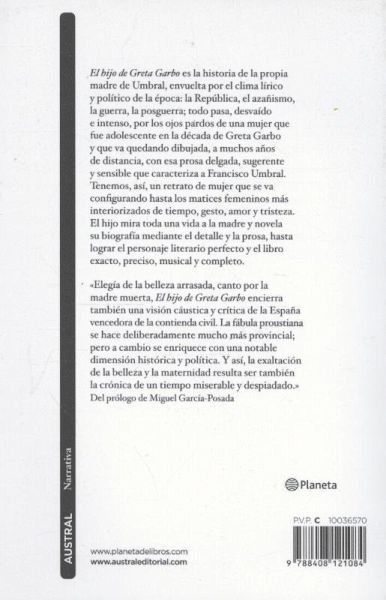 'Elegía de la belleza arrasada, canto por la madre muerta, El hijo de Greta Garbo encierra también una visión cáustica y crítica de la España vencedora de la guerra civil. La fábula proustiana se hace,deliberadamente, mucho más provincial; pero a cambio se enriquece con una notable dimensión histórica y política. Y así, la exaltación de la belleza y la maternidad resulta ser también la crónica de un tiempomiserable y despiadado', del prólogo de Miguel García-Posada.