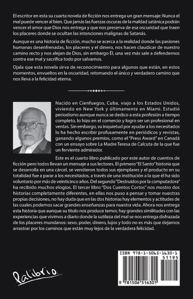 El escritor en esta su cuarta novela de ficción nos entrega un gran mensaje: Nunca el mal puede vencer al bien. Que jamás las fuerzas oscuras de la maldad satánica podrán vencer el amor que Dios nos entrega y que nos preserva de esa oscuridad que traen los placeres donde se ocultan las intenciones malignas de Satanás. Aunque es una historia de ficción, mucho se acerca a la realidad donde las pasiones humanas desenfrenadas, los placeres y el dinero, nos hacen claudicar de nuestro camino recto y nos alejan de Dios, sin embargo Él, una vez más sale a defendernos contra ese mal y sacrifica todo por salvarnos. Ojala que esta novela sirva de reconocimiento para algunos que están, en estos momentos, envueltos en la oscuridad, retomando el único y verdadero camino que nos lleva a la felicidad eterna.