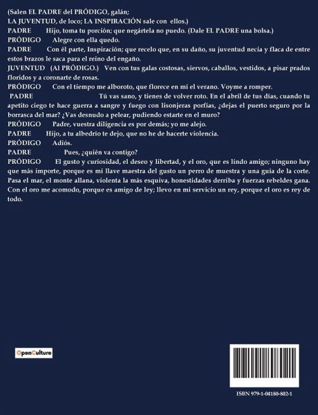 (Salen EL PADRE del PRÓDIGO, galán; LA JUVENTUD, de loco; LA INSPIRACIÓN sale con ellos.) PADRE Hijo, toma tu porción; que negártela no puedo. (Dale EL PADRE una bolsa.) PRÓDIGO Alegre con ella quedo. PADRE Con él parte, Inspiración; que recelo que, en su daño, su juventud necia y flaca de entre estos brazos le saca para el reino del engaño. JUVENTUD (Al PRÓDIGO.) Ven con tus galas costosas, siervos, caballos, vestidos, a pisar prados floridos y a coronarte de rosas. PRÓDIGO Con el tiempo me alboroto, que florece en mí el verano. Voyme a romper. PADRE Tú vas sano, y tienes de volver roto. En el abril de tus días, cuando tu apetito ciego te hace guerra a sangre y fuego con lisonjeras porfías, ¿dejas el puerto seguro por la borrasca del mar? ¿Vas desnudo a pelear, pudiendo estarte en el muro? PRÓDIGO Padre, vuestra diligencia es por demás; yo me alejo. PADRE Hijo, a tu albedrío te dejo, que no he de hacerte violencia. PRÓDIGO Adiós. PADRE Pues, ¿quién va contigo? PRÓDIGO El gusto y curiosidad, el deseo y libertad, y el oro, que es lindo amigo; ninguno hay que más importe, porque es mi llave maestra del gusto un perro de muestra y una guía de la corte. Pasa el mar, el monte allana, violenta la más esquiva, honestidades derriba y fuerzas rebeldes gana. Con el oro me acomodo, porque es amigo de ley; llevo en mi servicio un rey, porque el oro es rey de todo.