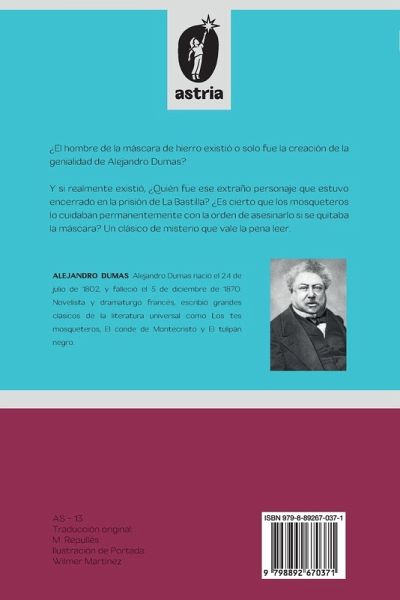 ¿El hombre de la máscara de hierro existió o solo fue la creación de la genialidad de Alejandro Dumas? Y si realmente existió, ¿Quién fue ese extraño personaje que estuvo encerrado en la prisión de La Bastilla? ¿Es cierto que los mosqueteros lo cuidaban permanentemente con la orden de asesinarlo si se quitaba la máscara? Un clásico de misterio que vale la pena leer.